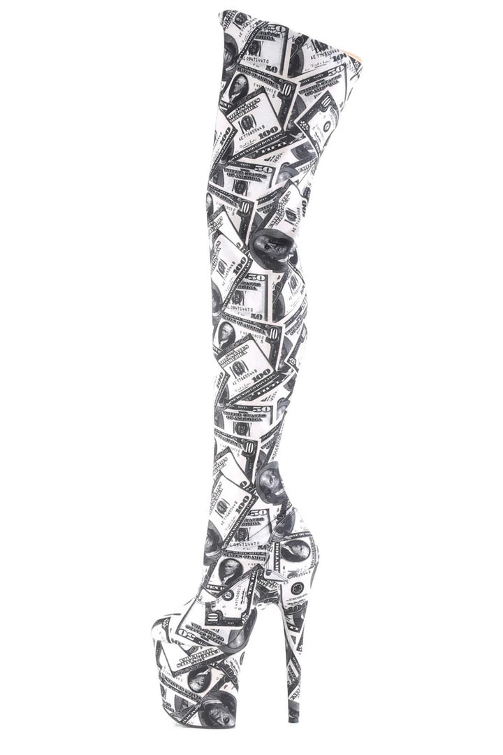 - Platform Stretch Thigh High Boot Featuring Dollar Print Upper and Matching Print Wrapped Platform Bottom