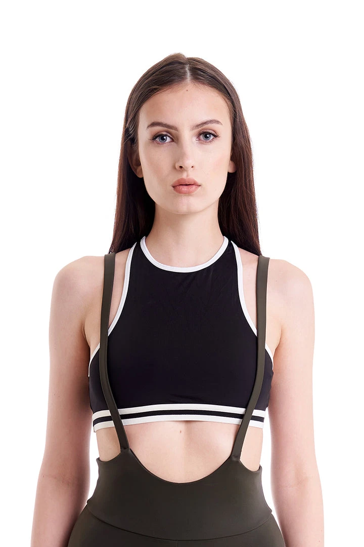 High neck black crop with white trim. We’re loving the mesh detail on the back that gives this top a design-led edge. Pair it with the matching high leg cut out bottoms or with black or white shorts and thigh high socks.