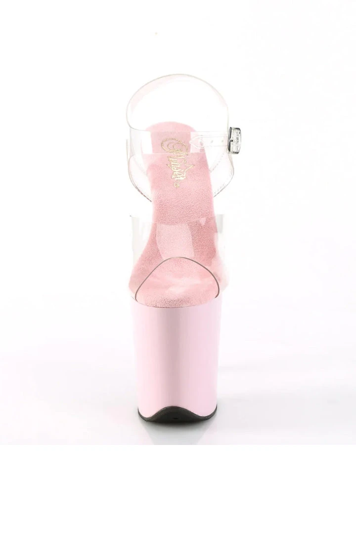 Bring out your inner baby spice with these glossy baby pink platforms with barely there clear straps.
