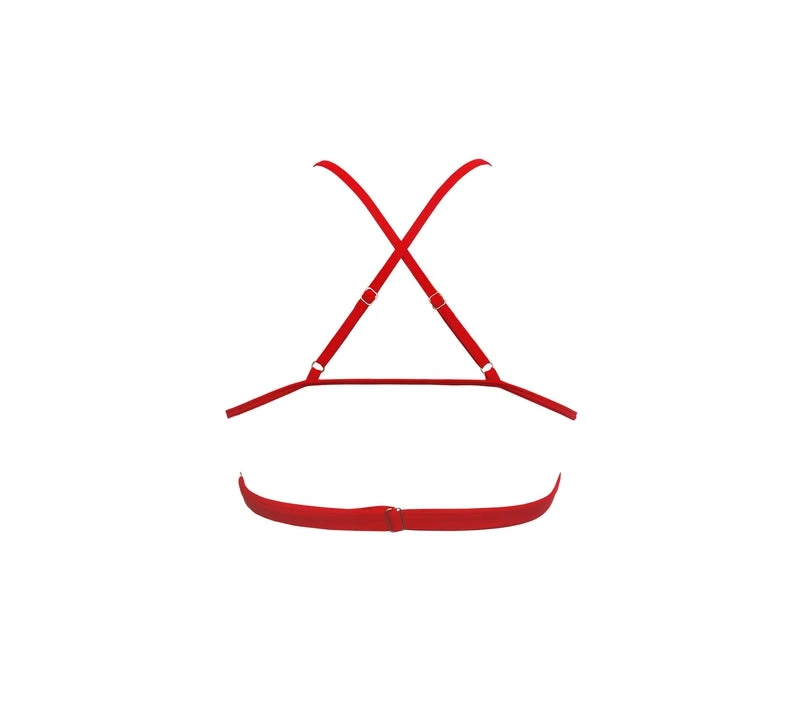 Nude triangular cup top with chest panel and adjustable back straps. Bound in red for a retro look.