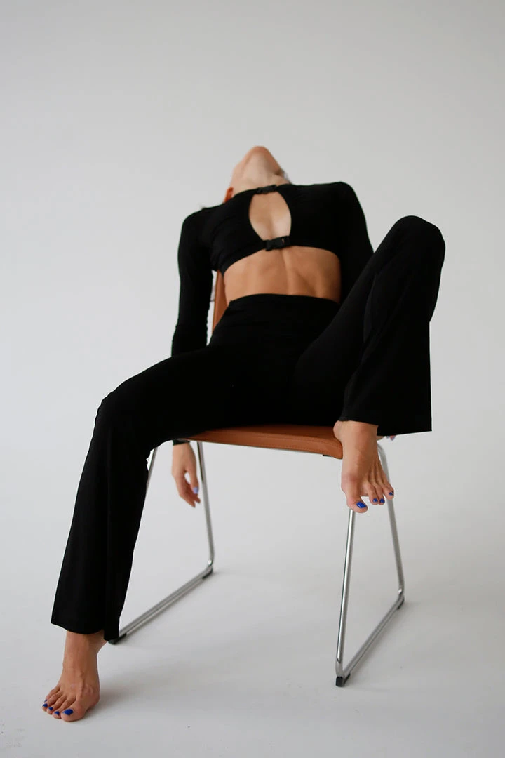 Styled with the Exo Wear Cut OutΒ Buckle Pants in Black!