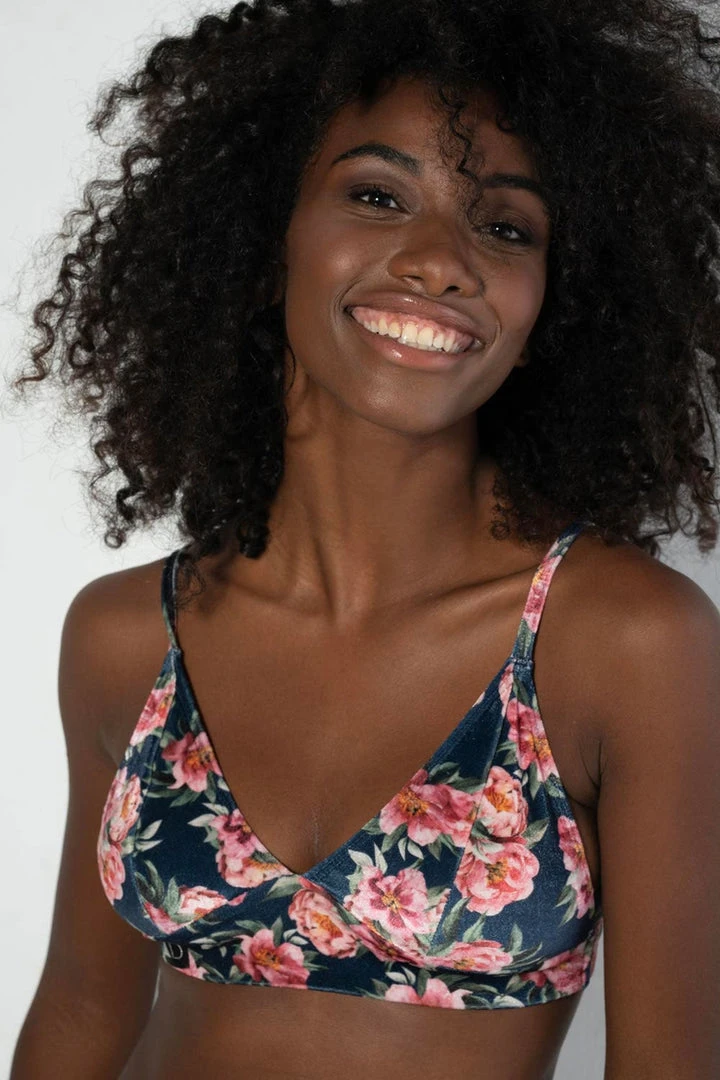 Floral? For winter? Count us in! We’ve found the perfect reminisce for summer and spring in this beautiful, soft, floral velvet fabric. The Monica top delivers absolute support and comfort, complete with removable triangle cups.